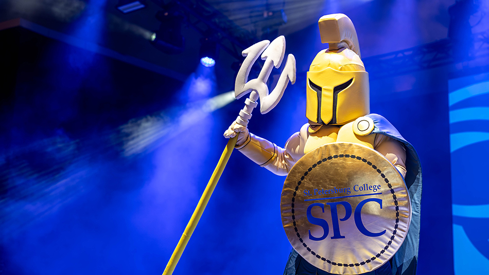 SPC Mascot Titus the Titan in his yellow costume and holding a spear congratulating 2024 graduates at commencment